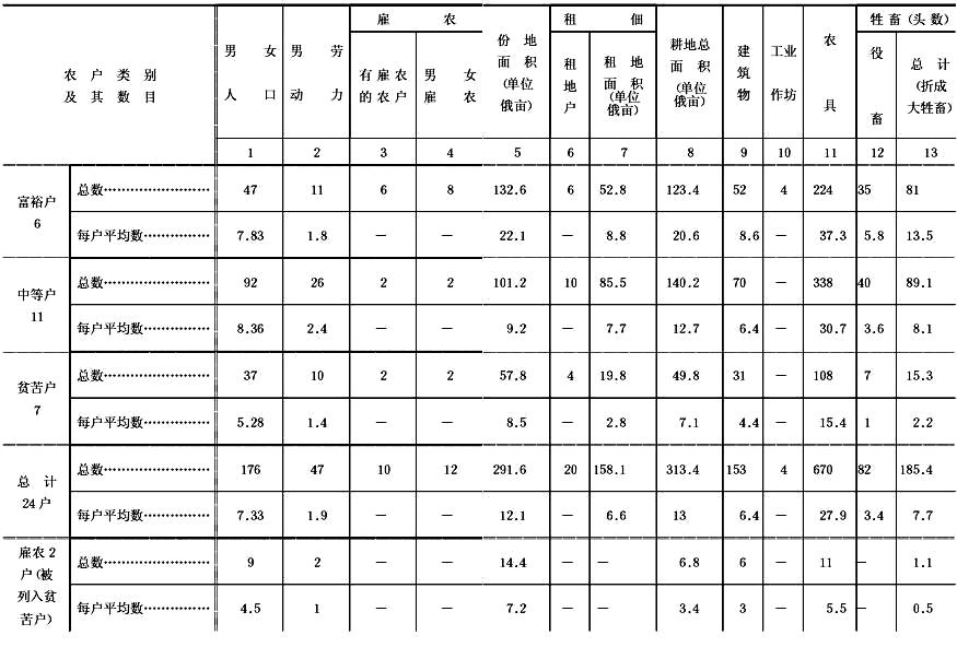 (20) 这里24个典型户同全县各类农户比较的方法,是同舍尔比纳先生用24户平均数同按份地面积分类的农户比较的方法是一样的。