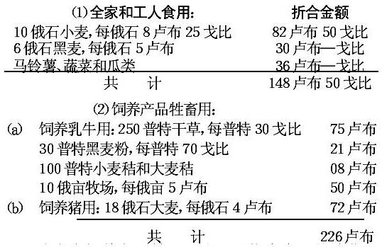 每俄亩经营面积的收入合20卢布27戈比。但是这仅仅是货币收入。为了求得全部总收入数额,必须把该农户所消 费的产品的全部价值加进去。根据这位主人的记载,他自己经营的产品的年消费量如下: