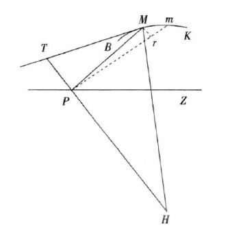 BMK是曲线(“极曲线”)。MT和这一曲线相切。P是坐标的极点或原点。PZ是极轴。PM是M点的坐标(恩格斯称之为“实在的横坐标”,现在叫做动径)。Pm是无限地接近于M的m点的坐标(恩格斯称这一动径为“虚构的微分横坐标”)。MH是切线MT的垂直线。TPH是坐标PM的垂直线。Mr是以PM为半径的弧线。因为MPm是无限小的角,所以PM和Pm可认为是平行的。因此三角形Mrm和TPM,以及三角形Mrm和MPH,都可以看做是相似三角形。——653。