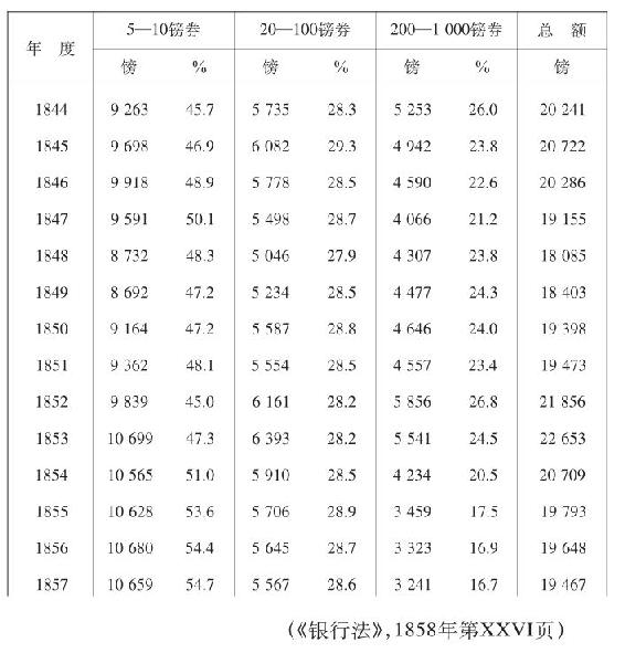 下表是英格兰银行的银行券——5镑和10镑券、20镑—100镑券和200镑—1 000镑的大额券——每年在公众手中的年平均额,以及每一栏银行券在流通的银行券总额中所占的百分比。数字以千为单位,千以下的三位数字从略。