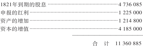 这是11 642 400镑资本在19年中获得的利润总额。(丹·哈德卡斯尔《银行和银行家》1843年伦敦第2版第120页)如果我们按照相同的原则来估计也是在1797年暂停兑现的爱尔兰银行的总利润,我们就会得到如下的结果: