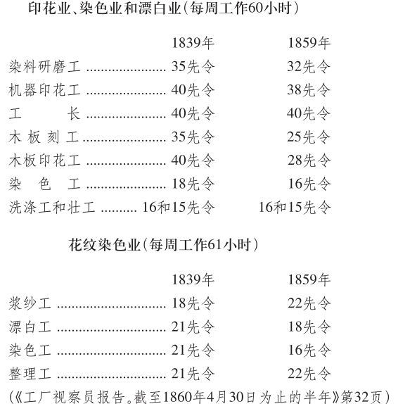 “印花厂、漂白厂和染厂中的情况,直到1860年,这些工厂的工作时间仍然和20年以前一样,这些工厂的受工厂法保护的工人往往被迫一天劳动14或15小时”。(2)