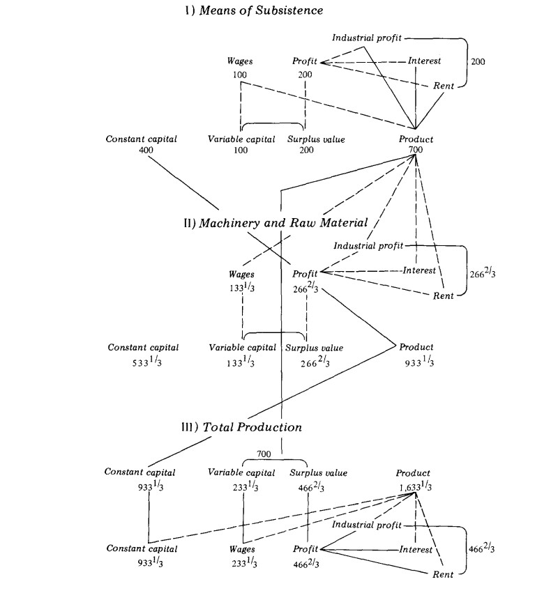 2) Commercial capital and money-dealing capital are not displayed separately, as this would make the table too complicated. 3) For the same reason, reproduction is conceived as remaining constant, since the presentation of the accumulation process would equally tend to confuse the simple conception of the main movement.
